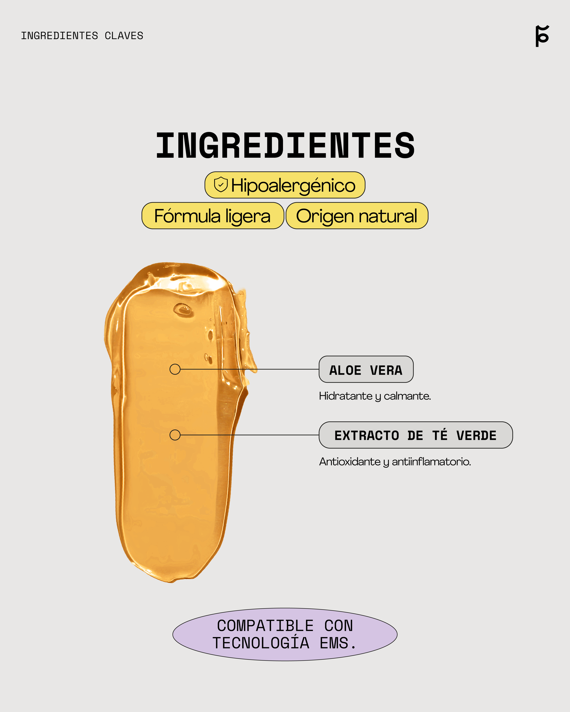 Agua, aloe vera (Aloe barbadenis), extracto de té verde (Camelia sinensis), trietanolamina, benzoato de sodio, sorbato de potasio y alcohol bencílico.
