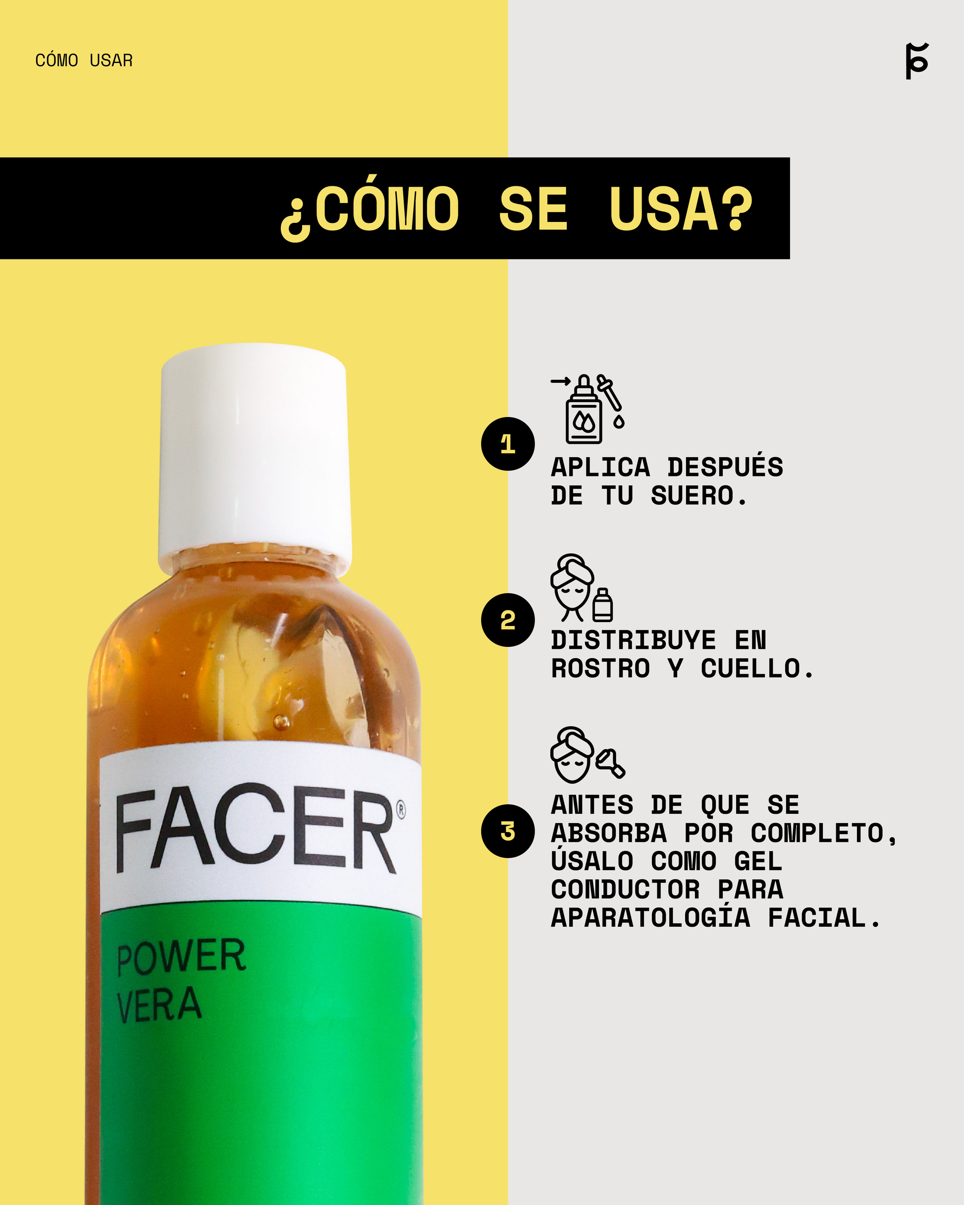 Después de tu suero FACER aplica el Power Vera en rostro y cuello. Aprovechar antes de su absorción para usarlo como conductor de aparatología facial.