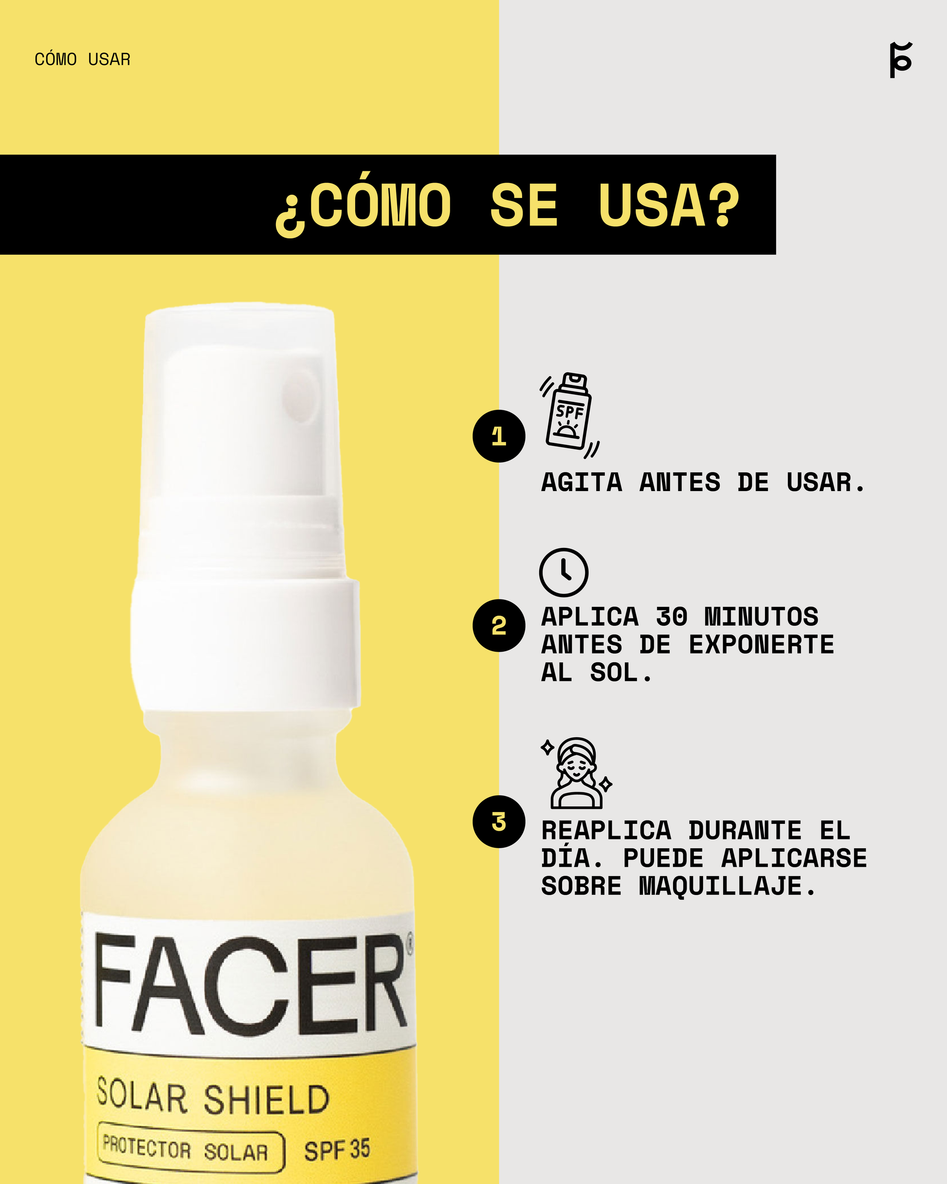 Agitar antes de usar. Aplicar 30 minutos antes de exponerse al sol. Reaplicar durante el día. Se puede aplicar sobre el maquillaje, para todo tipo de piel.