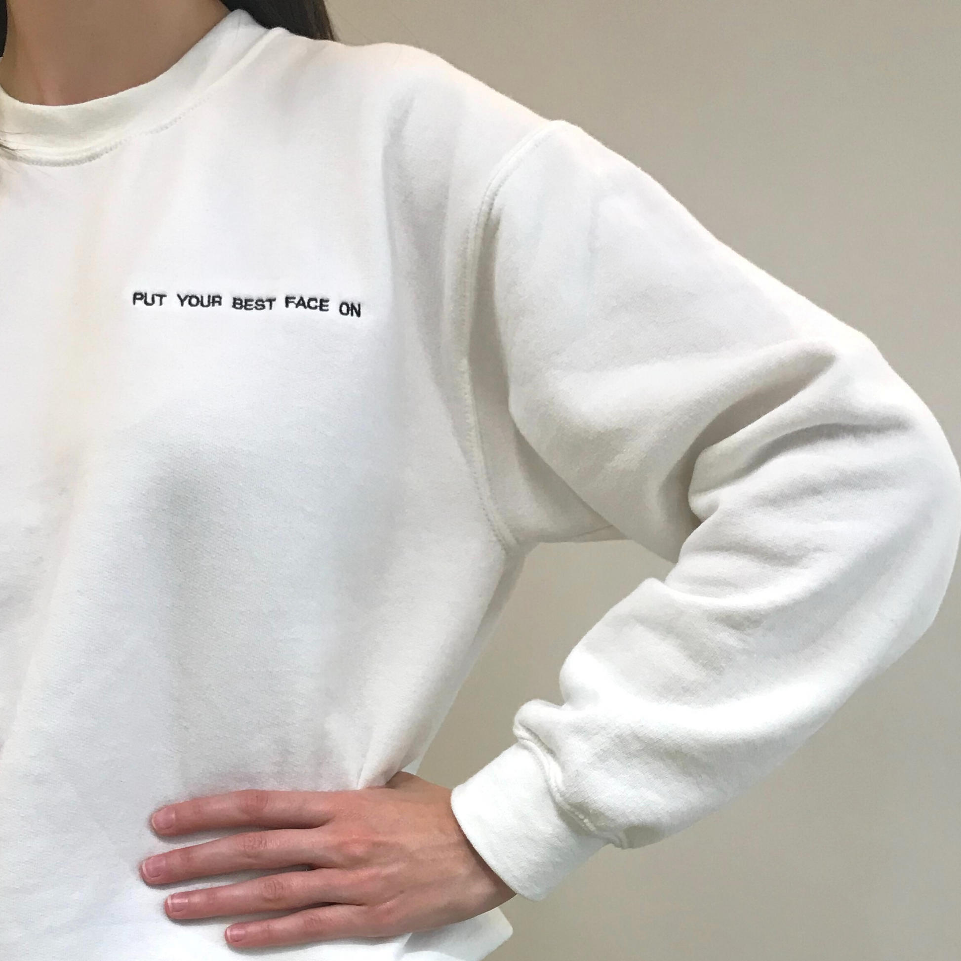 Sudadera color blanco, letras negras con la frase célebre de FACER #PutYourBestFaceOn
